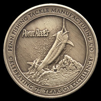 Para comemorar os seus 75 anos de história, a Penn, lança no mercado uma carretilha especial “edição de colecionador”. que traz em sua lateral o verso da moeda comemorativa.